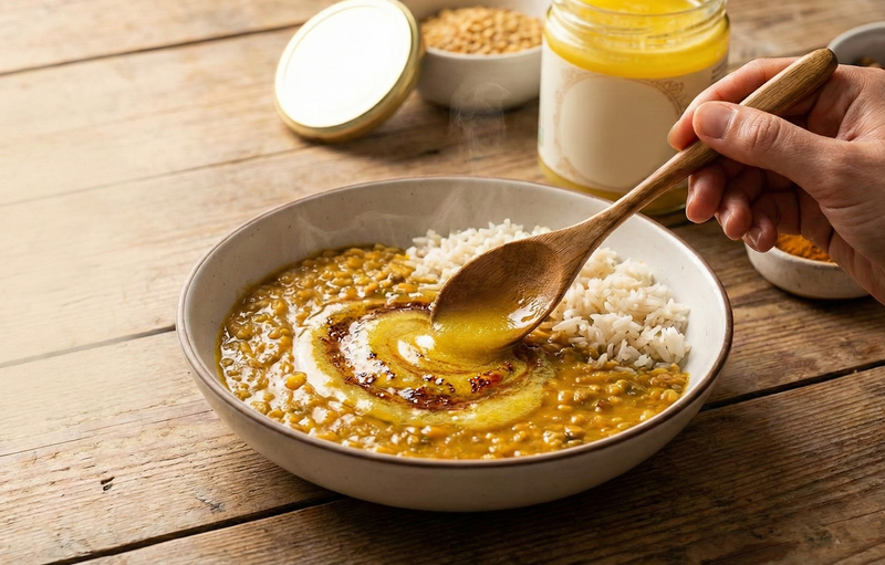 Woman in a kitchen pouring a sacred staple turmeric ghee from a jar into a pan with vegetables.